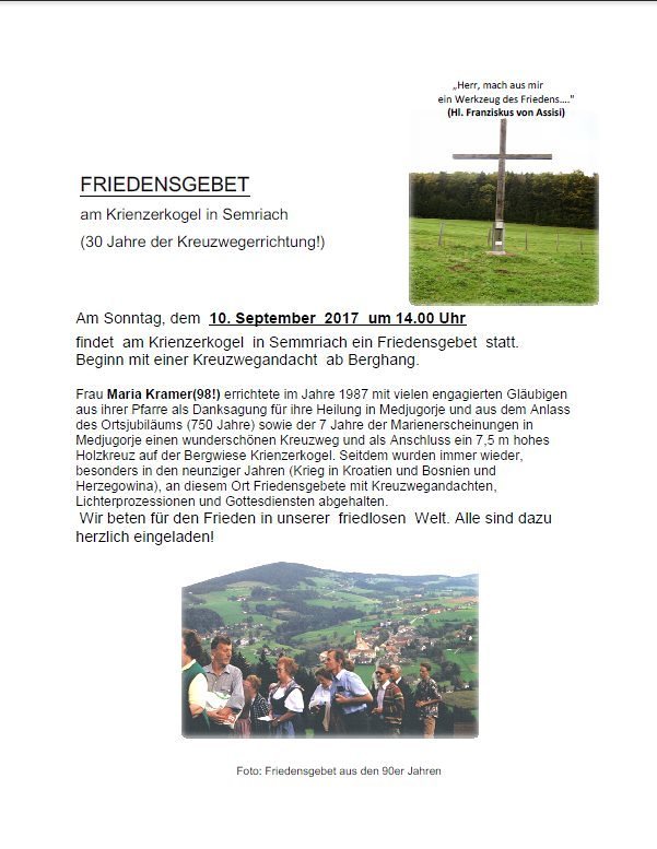 findet  am Krienzerkogel  in Semmriach ein Friedensgebet  statt.
