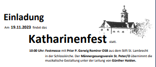 Katharinenfest Weinburg Einladung zum Katharinenfest am 19.11.2023 in Weinburg! 10.00 Uhr: Festmesse in der Schloßkirche anschließend gemütliches Beisammensein im Kultursaal Weinburg. mehr: Katharinenfest Weinburg