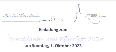 Erntedankfest und Sanierungsabschlussfeier 8. Oktober 2023, 09.00 Uhr Erntedankmesse anschl. herzliche Einladung zur Sanierungsabschlussfeier der Pfarrkirche St. Veit im Pfarrgarten! mehr: Erntedankfest und Sanierungsabschlussfeier